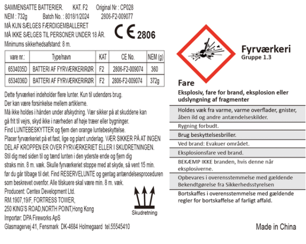 Eksplosiv, fare for brand, eksplosion eller udslyngning af fragmenter.